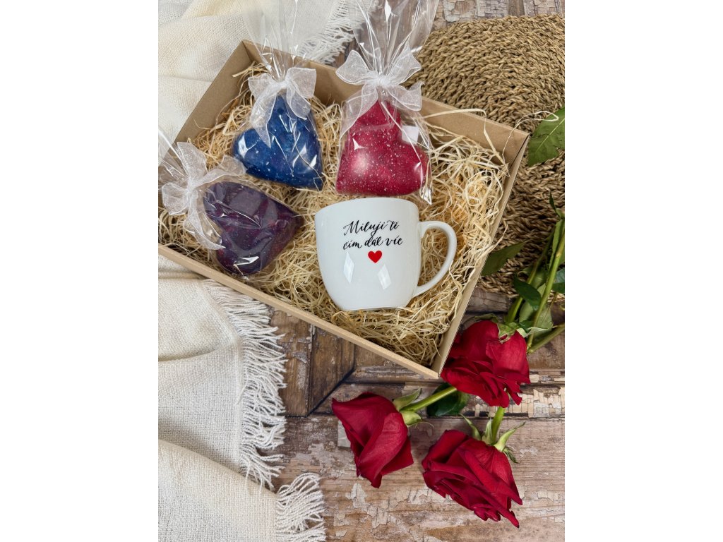 Dárková sada Miluji Tě čím dál víc + červené srdíčko plněné lískovkou